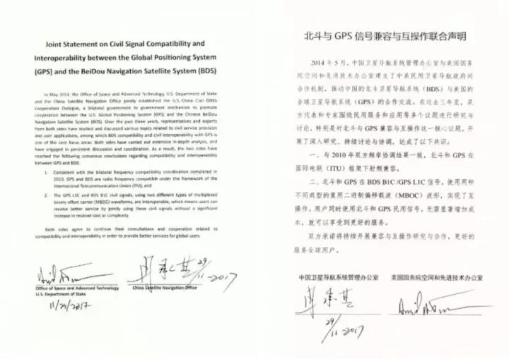 11月29日,在中国卫星导航系统委员会王力主席和美国国务院乔纳森·马戈利斯助理副国务卿的见证下,中国卫星导航系统管理办公室冉承其主任与美国国务院空间和先进技术办公室戴维·特纳副主任签署了《北斗与GPS信号兼容与互操作联合声明》。声明表示,两系统在国际电联(ITU)框架下实现射频兼容,实现了民用信号互操作,并将持续开展兼容与互操作合作。